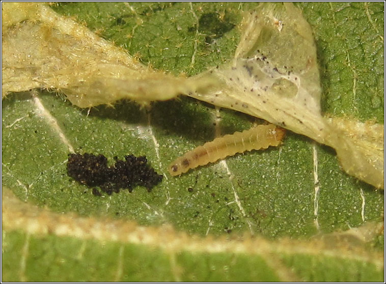 ABH 15.051 Wingspan: 9mm Flight time: May and August Food plant: Viburnum spp. Mine: July and September-April A lower surface tentiform mine, usually formed between two side veins. The lower surface is creased, initially whitish then becoming brown. |